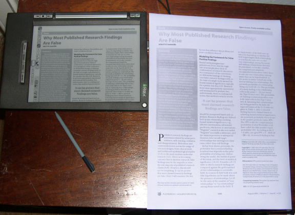 For multi-column journal articles I used to rotate to landscape view and then use the stylus to move the page around to go up and down the columns. Once I got used to it this worked well. Recently, however, wpd has created a patch that follows the text so I can now zoom in to make the text the same size as the paper version and just use the flip bar to move down the columns of text and then up to the next one. This is an awesome feature. (And people on here are in the process of combining the fullscreen and column-wise patches along with other goodies into one.) [Edited to fix the URL] Here's a few photos of a journal article The first shot shows what it looks like in portrait view. This is about 56% of the paper copy. I can read this, but I wouldn't want to read for more than an hour or so at this scale. If you print this page to A5 (e.g. two pages per view) you get about the same size, but in my experience the quality of the paper printout is not as good as seen on the iliad. The second shows landscape view. This is about 80% of the original paper copy. The third shot is portrait again using the column-wise viewer. You can see the current block of text with the navigation box around it. This is the same size as the paper copy. [Apologies for the lousy photography] Last edited by daudi; 10-30-2007 at 07:08 PM. |