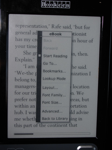 And it HAS bookmarking, jump to page, the ability to add in other TrueType fonts as well as MP3 support! Yes, Bookeen created a fully-functional bookmarking interface as well as a way to specify an exact page number for Goto Page! I'll be posting pictures today. Derek |