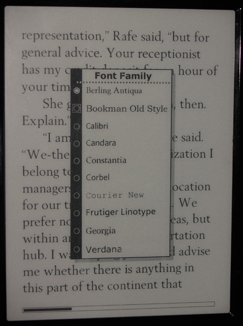 I've included a shot of the basic page with a bookmark added, one of the bookmark menu, one of the Go To menu, one of the page number specifier for Go To Page, one of the new About screen, one of the main (Library level) menu, one of the Font Family menu, one of the main (1st level) menu within the ebook and one of the Advanced submenu. Note that there is a Language setting on the Advanced menu. Right now that means the user can choose between French and English menu names. I would presume other languages will be added for localization. Note also that the Library-level menu allows for the thumbnail images to show text (PRC, PDB, and so forth) indicating the file type. Further, the Font Family shot demonstrates that I successfully (It's all drag-and-drop on the PC) added Berlinger Antiqua, Bookman Old Style and Frutiger Linotype fonts to my Cybook. And the page specifier is a dream to use! Derek |