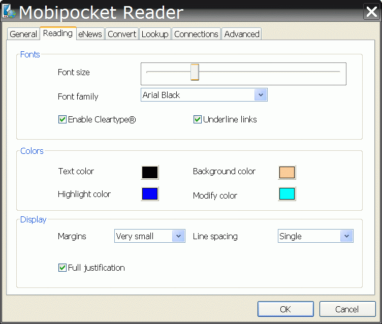 One shortcoming of the Java MobiPocket Reader (e.g. on the iLiad) is that it does not allow customization of margins and line spacing. The Windows version does (see the attached image), although the "settings" pop-up is hard to find (tiny arrow next to ? button). I would actually prefer a line spacing less than "single", because more text per page means fewer page turns, but at least larger spacing is available for those who prefer that. So, what does the Cybook MobiPocket Reader support? I see your first photo includes a "layout" option, which looks promising. |