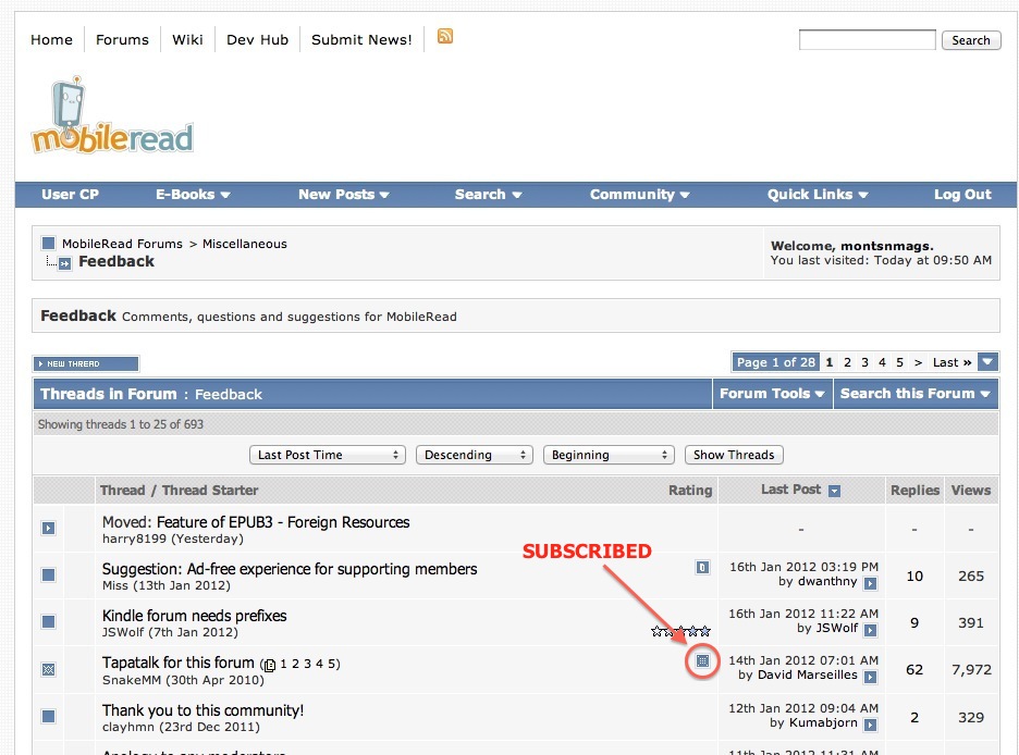 As others have specified, your User Control Panel (User CP) will also list all threads you have subscribed to which have received new replies. It's actually my default bookmark for MobileRead and is the same for everyone: https://www.mobileread.com/forums/usercp.php If you want to look at all threads to which you've subscribed, whether they have new posts or not, there is a link down the left of your User Control Panel called "List Subscriptions". You can go straight there with this link: https://www.mobileread.com/forums/sub...ewsubscription Note that you can also get to that point from the "Quick Links" pull-down meny at the top of every forum page (the item "Subscribed Threads"). If you wish to change the default behaviour for what happens when you post to a thread (whether it automatically subscribes you, sends you an email, et cetera), you can find that under "Edit Options" in your User CP. A direct link is here: https://www.mobileread.com/forums/pro...do=editoptions (It's under "Messaging & Notification", and second sub-box down, called "Default Thread Subscription Mode"). Cheers, Marc |