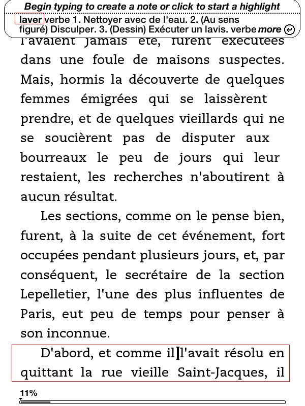 1. You cannot select parts of a word. 2. The Mobipocket word segmentation algorithm wasn't properly implemented in the Kindle code. For example, if you look up "l’avait" in the default monolingual French Kindle dictionary you'll get the entry for "laver" instead of "avoir" because the Kindle app apparently treats all quotes as punctuation characters and deletes them before the string is passed to the dictionary lookup code. Unfortunately, the actual Kindle behaves exactly in the same way, which is rather annoying, because Mobipocket Reader on which the Kindle app is based doesn't have this problem. If you want to use foreign language Mobipocket dictionaries with ebooks on the PC, I'd recommend using Mobipocket Reader instead, because it allows you to search multiple dictionaries and it'll find words such as "l’étoffe." |