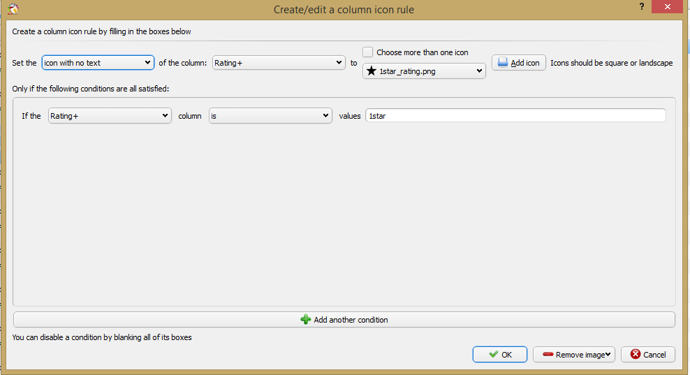 ![]() So, what do you need... 1. Download the icons I made (rating_icons.zip) 2. Create a new custom column over 'Preferences -> (Interface) Add your own columns' (picture01) 3. Go to 'Preferences -> Look and Feel -> Column icons' and add the rules and icons for every star rating (picture02 and picture03) DONE! As you can see in the example picture (picture04) the stars are a bit bigger than the original rating stars but otherwise you wouldn't really see the 1/2 star. Mini Edit: I added a smaller rating version, if you want your stars to look more like the default ones (rating_icons_2 - picture and zip) Edit_part2: I added a 1+ and 2+ and a 0star icon for stories like 'don't ever read again' for both versions. In the bigger icon zip you find 3 icons for the 0star (I couldn't really decide, so I let you decide for yourself). Of course if you use all icons you have to extant your values in your custom column and your rules (just in case you forgot that). Last edited by MiniMouse; 08-18-2014 at 01:41 PM. |