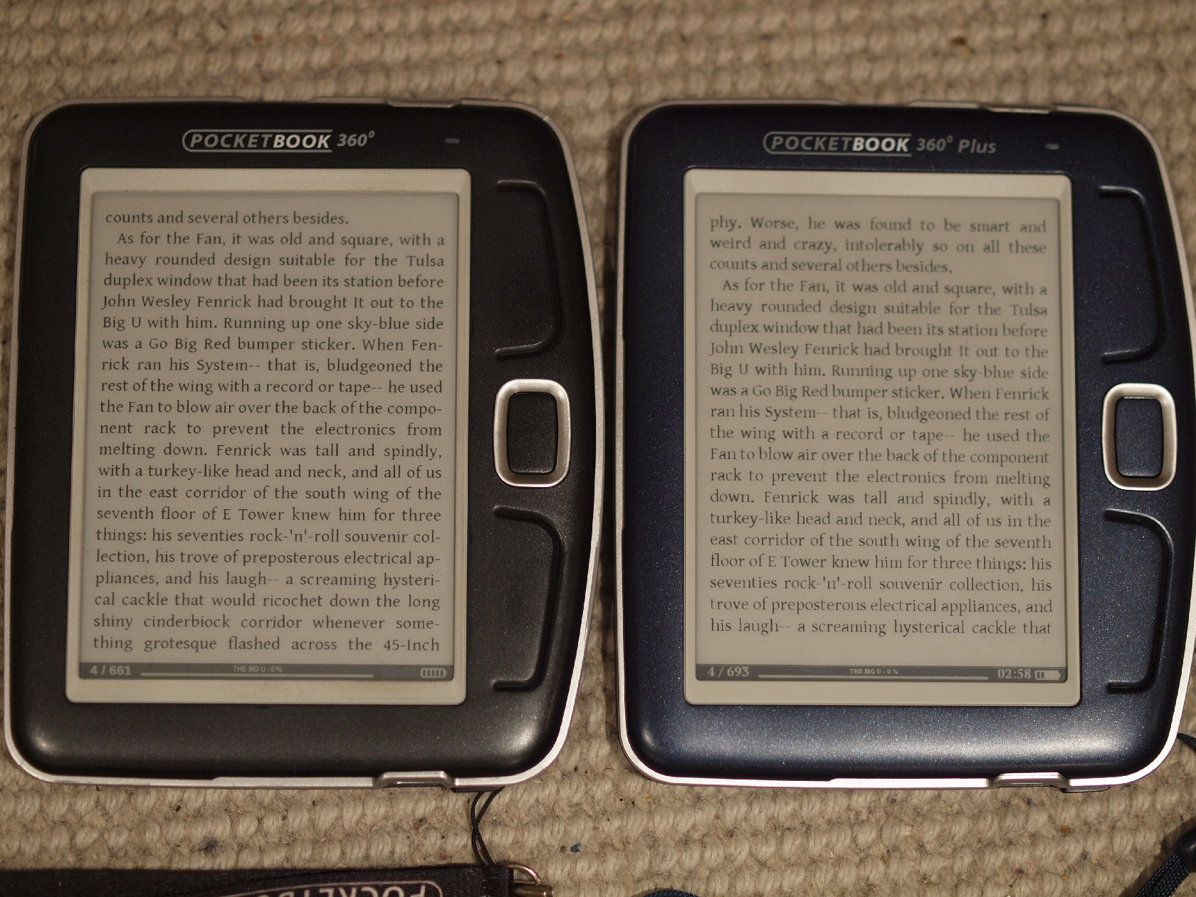 I have copied my favourite fonts over, and I couldn't find configuration where the fonts would look good. Unfortunately the Christmas were drawing close and I had to hand over the gadgets ;-) I had concluded that the new owners would have to find fonts that look good on the new readers. I think it is caused by different software for rendering text, or perhaps just different setting in the antialiasing. This is one of reasons I am in no hurry to switch from my PB360 to PB360+. Another reason is that I found the browser in the newest PB360+ firmware completely useless. Perhaps developers were too preoccupied testing it on touch-enabled devices - I have heard that PB602 devices are not in production anymore. |