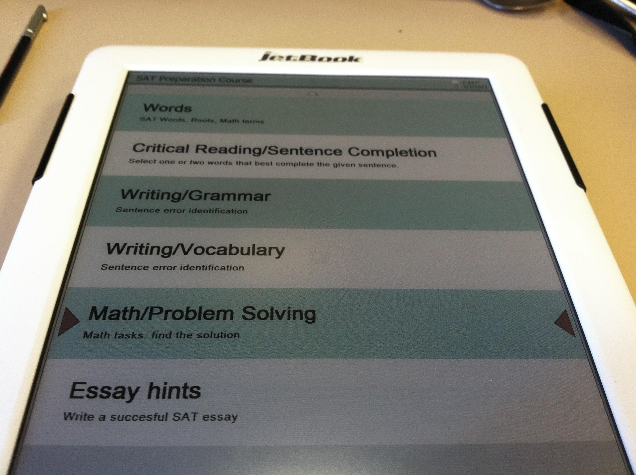Casing and Main Screen The case for the jetBook Color is hard enough to protect it against falls and soft enough to make it feel pleasant to the touch. It also has a unique rigged (almost Louis Vuitton checkered) design instead of a lame matte finish with a strap that flips over and holds the case together. You can stand it up by pulling out a strap inside the case, and even fold it sideways for a panoramic view (I’ll show in later pictures). You can navigate using the buttons on the lower part of the device, or using the stylus that comes with it. Sometimes you have to double tap to get into a section, I usually click on the section to highlight it and then click the “OK” center key to access it – kinda like that way better. Sometimes the touch lags but it’s negligible. The main menu has 6 features: My Library, Recent Readings, Classwork and Homework, Oxford Reading Support, Language and Games, Science and Math, Audio Books and Music, Settings. My Library This is where you store your books. A great feature is that you can create folders to keep track of where you put your literature. I’ve loaded my professor’s PDF to this already and they look awesome, I know my mom loaded her documents for work as well. There is a 50 State Reading list programmed to mine which has about 70 books which is a nice addition. Highlighting: You hold the stylus to the start point, drag it to the end point, and then select “Menu” when it pops up. Here you’ll have the options to: Explain with Oxford, Translate in Dictionary, Translate (in their text translator – set to Spanish right now), and Mark for Summary (this is cool bc you can save the text you highlighted for later in a separate section – which you can then click the “Menu” key and access.) The “Menu” key when inside a book will bring up the following menu: Go to Page number, Go to Table of Contents, Text Search, Bookmarks, Show Summary, Change Font Size, Encoding, Book Language, Full Screen, and Help. There would be too many screenshots to have all of them shown here but if everyone wants I can definitely load them up. Recent Readings Self-explanatory Classwork and Homework This section is blocked. I called Ectaco about it and they told me it’s only available to schools right now. No biggie, makes the main screen look nice though. Oxford Reading Support This is the first section with subsections. I’ll go through each one separately below: Oxford English Dictionary – Here you can look up individual words and it will give you the definitions, parts of speech, examples, etc. You can also have the word pronounced fluently which is great. Talking Oxford English<->Spanish Dictionary – Similar design to the previous section but here you can additionally translate from English to Spanish and vice versa. Fluent pronunciation for both languages. SAT Preparation Course – This is insane. If I had this when I was in high school I would have killed it on the SAT! But since I have to be very neutral with this review I’ll write more about the functionality. It’s split into 6 sections ranging between Words, Critical Reading/Sentence Completion, Writing/Grammar, Writing/Vocabulary, Math/Problem Solving, and Essay Hints. You basically take an endless amount of tests, it tracks your performance so you can see how much better you do on each test, and gives you tips for each section. The letters A, B, and D were missing from my option choices (lol) but they still worked when selected, prob a small bug. ***Looks like I can't upload anymore pics right now so I will post a continued review below***PLEASE DON'T INTERRUPT THE POST BY POSTING YET!!!! |