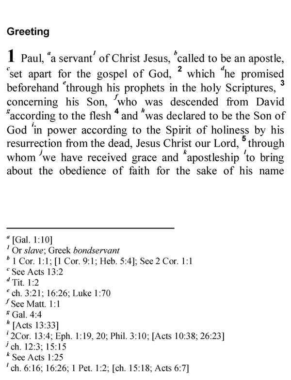 1) Footnotes - I've attached both a .doc & .pdf of Romans 1 & 2 (I read the ESV copyright laws and I don't think I'm violating them, if I am the files can certainly be removed). It's easier to see than explain, but here's the short version. Using Logos Libronix software I copied Romans 1 & 2 to Word. All is great, footnotes show up, but the problem is that Word only allows 1 footnote per line. In normal bibles they are separated by some spaces. This results in a lot of wasted space at the bottom of each page. I'm wondering if there's any way around this. Google gave me nothing. I also tried WordPerfect and even a trial of Adobe FrameMaker (too complicated). 2) Direct Page Control modification - convert books into numbers (Gen = 01, Ex = 02... Rev = 66), and you're all set. Entering 45 ("Goto page: 45") would display "Romans" and then enter chapter & verse. I took a look at the Direct Page Control hack source code with HackBuilder, but couldn't figure it out (I don't know programming language, unfortunately). I think this would be an easy solution (although tedious to program as well as learn). If someone could get me started, I could fill in the rest. Any thoughts? The PDF is ready to load onto your reader, and is remarkably easy to read without any modification/'Rasta'-fication. Last edited by DoctorBri; 12-04-2007 at 08:55 PM. Reason: image was waaaaay to big |