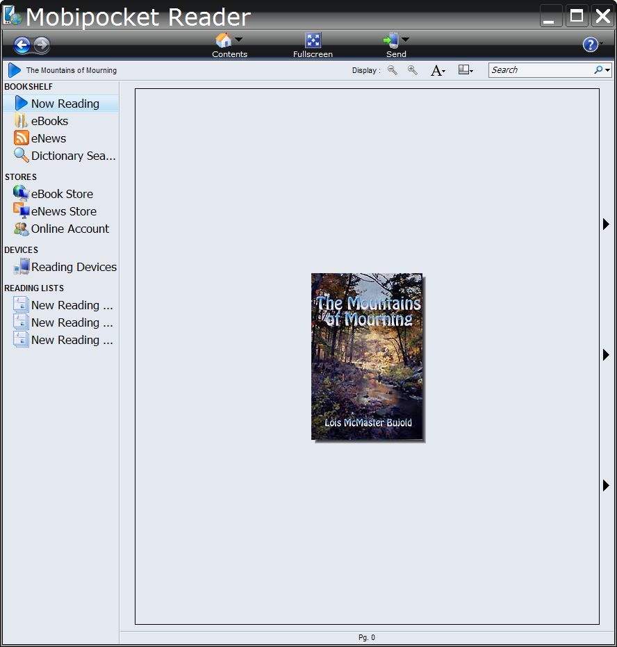 I enclose screen shots from Windows Mobipocket Reader of the cover page from the original PRC version, the proposed new MOBI version, and the LIT version converted to MOBI with ConvertLIT and mobgen.exe -jpeg. The new MOBI and old LIT to MOBI versions are very similar, e.g. both have the author in MobiPocket's library view and have similar "contents" menus, but the new MOBI is still using GIF images and so has a very small cover image. The PRC version does not have a separate cover image - it is just part of the 1st page. It also has a TOC link in the document (seen in the screen shot) which is missing in both MOBI versions (all three have a TOC under "contents"). Both MOBI versions have a smaller version of the cover image in-lined at the start of the main document, which helps on the iLiad which can't display cover images (nor can FBReader).