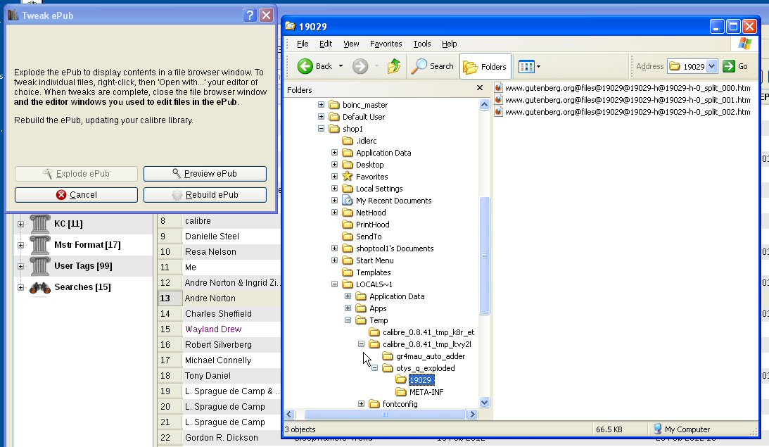 I have a feeling that i am missing something 'simple'. Can someone please post the process as they understand it. I have detailed my process below. 1. select the book to be updated 2. click 'edit metadata' 3. click the red book button in the top left 4. browse to the updated htm file and select 5.click ok to exit edit metadata 6. click convert books button and then click ok to resubmit as a job 7 preview changes to book thanks in advance Gunwoody |