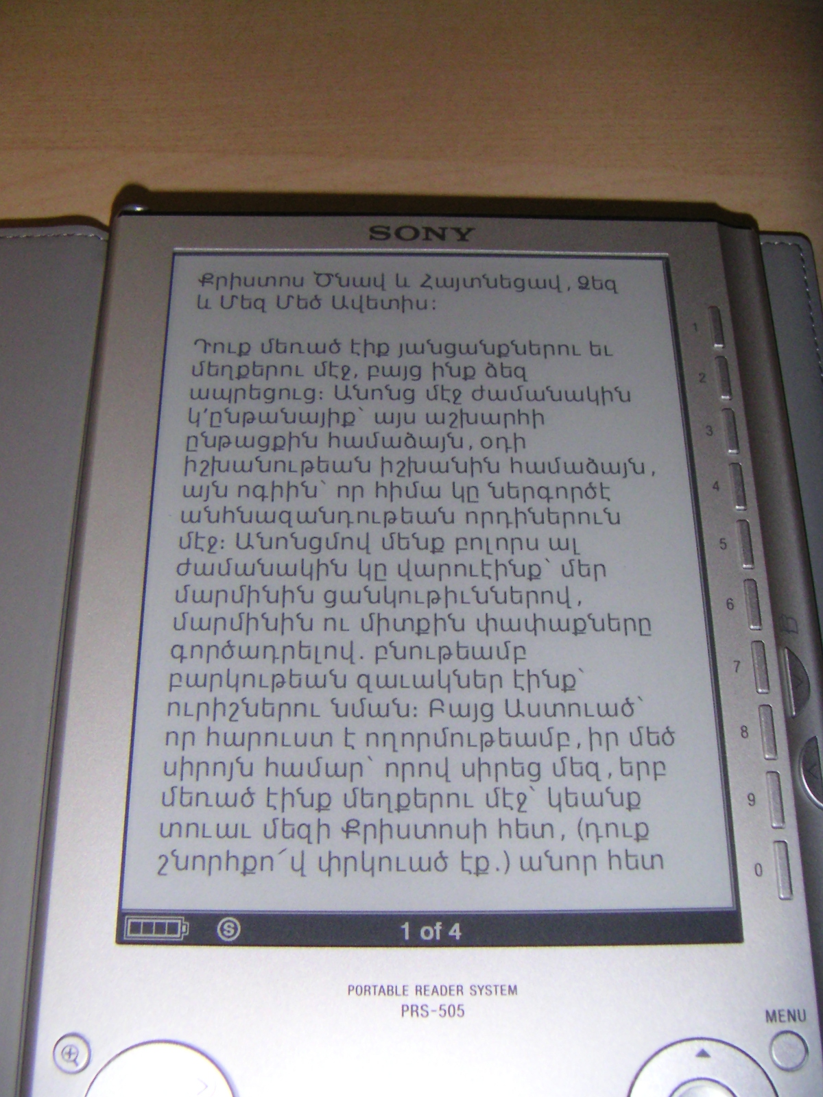 Please download OpenOffice.org - start a new document - set page size to 90mm x 120mm - set page margins to 2mm - insert a few pages of armenian text. I recommend font size 12 points, but feel free to include several font sizes - export the resulting file as pdf - post it here so somebody with Sony Reader or Amazon Kindle can try to view it. |