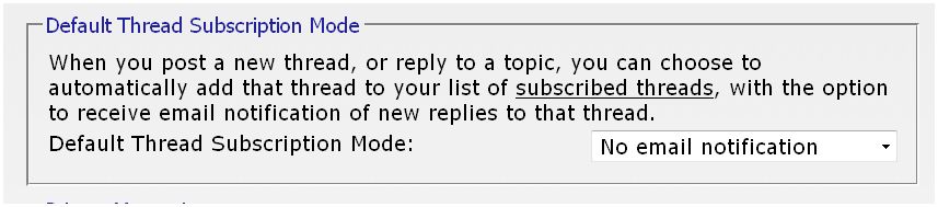 On your User CP page of Subscribed Threads what does it say under "Notifications"? This snip shows two options that are on my page. You can check what your "Notification" is set for the subscribed threads by going to your "User CP" and scroll down to "Edit Options" Then scroll down the center of the page until you see "Messaging & Notification". There will be a box for "Default Thread Subscription Mode" The drop down box will let you choose: Do not subscribe No e-mail notification Instant e-mail notification Daily e-mail notification Weekly e-mail notification |