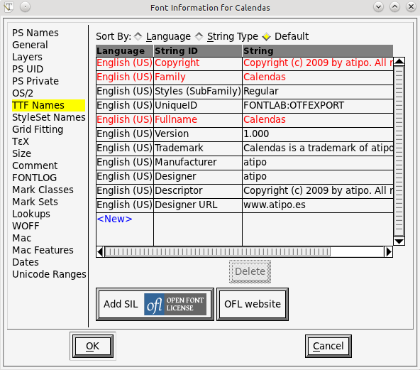 If I delete all the name fields (PS Font Name, Full Name, Menu Name, FOND Name) and click "Build Names", this comes up: Maybe your e-reader uses the "Menu Name" field? I'm not sure... since computer software (Windows or Linux) seem to pair them up by Family Name. Try to match them with whatever FontForge calls them and see what happens. Also, you should probably reboot the device or something after you add the fonts. Just sayin'. It could be something obvious like that. |