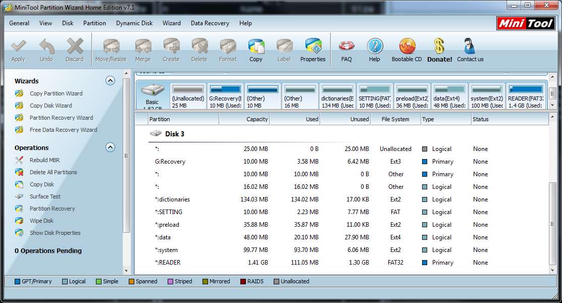 All necessary partitions (but /system) could be done "in-place" with all data intact in about 5 minutes. If you want to change /system (which is not necessary) - it is ext4 - and tool (despite what is declared) cannot handle it properly, so you have to use tar to save data, delete and create partition and restore. 2. Yes - you have to be in recovery mode with my backup and recovery SD card 3. Yes - you reduce READER partition and than move and enlarge next one e.t. c. There is one additional step - enlarging "extended" partition to which (if my memory does not fail me) data and system are children. Unfortunately I did it some time ago and do not remember all the details - but it was not difficult. 4. I did backup first and had to recover once in the middle of procedure because I was trying to do something tool was not capable of doing. So do backup - it takes several minutes and is easy. |