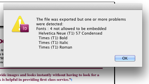 I have some InDesign files that I need to convert to epub. When I attempt to convert I get the message "4 fonts ( name of fonts) are not allowed to be embedded". I'm in OS X and need to figure out a way to do this.