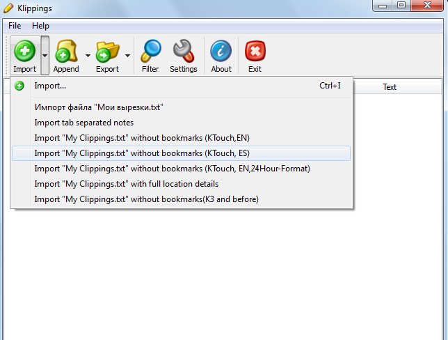 Import> "Import "My Clippings.txt" without bookmarks (KTouch, ES)" |