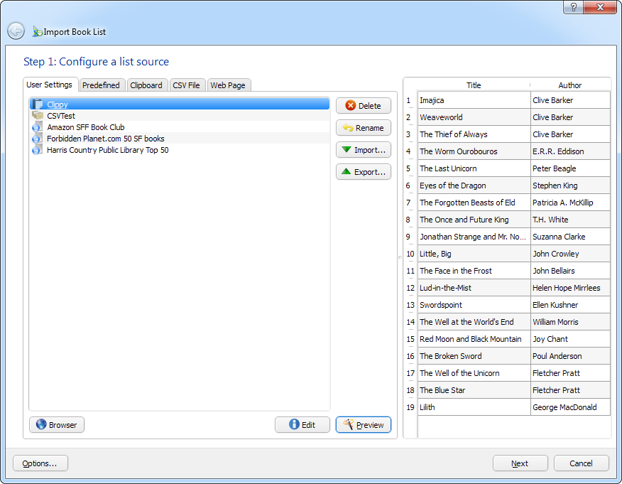 In this particular case I am very interested in any suggestions if the plugin is going to push a few buttons for people to make it more useful to them. I saw a post the other day from someone new to calibre who had their book collection stored in Access or Excel from memory - if they exported that as CSV this plugin already has the functionality to import that for them.I am particularly interested in websites people would like to import from, because it is only through trying to setup xpath/regexes for those do I find out just how "usable" that tab is. I've already got built-in configurations defined which will take any Amazon "Listmania" list. I've also got any Goodreads "Listopia" list covered, as well as their "Most popular in xxx" type lists. For those sorts of sites you can just click the "Load" option in the plugin, drag/drop or type in your specific list url from the website and you are off and running. If you want to reuse that URL you can save it as your own settings. I've also randomly tried a few other pages like Wikipedia Nebula Best novel winners etc and so far they all were fairly easy to setup. I'm still tweaking and tuning it to try to automatically strip the most common "cruft" out and maximise the likelihood of matches without manual effort but it is fully operational in its current state. I've held off on the beta due to no-one responding and let myself get diverted with the "Favourites Menu" plugin and also a big release of "Find Duplicates" I will put out there after the next calibre release. |
