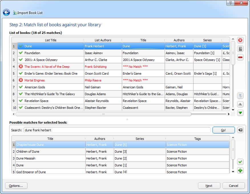 To minimise the manual effort of reconciling book titles/authors against your library, I have implemented a fuzzy logic auto-matching mechanism, using some principles from the Find Duplicates plugin. Once you have the raw list data and move to step 2 of the wizard, the plugin performs a progression of permutation of identical, similar and slightly fuzzy matches of title and author to find a match for you. You can step through the remaining unmatched books and either directly search your library for a match, create an empty book if you don't have it or remove it from the list if it isn't of interest to you. Here are some screenshots as it exists right now. I'm still making additions but if there is any initial reaction I would *love* to hear from you. Whether it is questions about the UI/behaviour or just suggestions for website pages to see included... I will likely post a beta on this thread in the next few days. Last edited by kiwidude; 07-14-2012 at 02:08 PM. Reason: Updated screenshots |