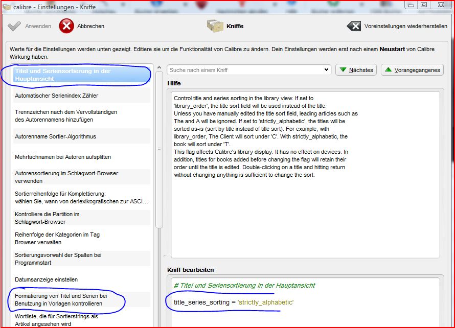 ![]() a) Woher weiß dein Reader von Autor und Titel? Ich gehe mal davon aus, dass er diese Information nicht aus dem Dateinamen, sondern aus den Metadaten des auf dem Reader befindlichen Buches entnimmt und somit hat das Buch auch Metadaten. Calibre bestimmt nicht die Interpretation von Daten für einen Reader, sondern stellt nur Daten Verfügung. Was der Reader nutzt, bestimmt ausschließlich der Reader. Eine Korrektur eines weit verbreiteten Irrtums: Es gibt keinen Reader, der etwas mit den Metadaten von Calibre anfangen kann. Die Reader haben entweder eigene Strukturen und / oder nutzen die Metadaten, die in Büchern stehen. und diese sind i.d.R. schlechter, als sie sein sollten. b) So wie du es beschrieben hast, macht Calibre alles richtig. Nur du hast nicht verstanden, was die Einstellungen bedeuten. Also, wenn in dem Feld "Sortierung nach Titel" "Schatz im Silbersee, Der" steht, dann ist die entsprechende Einstellung in Calibre für die Titelsortierung nicht "strictly_alphabetic" sondern "library_order" Prüfe, was in den entsprechenden Einstellungen unter Kniffe steht und ändere diese nach deinen Notwendigkeiten. Mache es nacheinander und prüfe das Ergebnis der Änderung, damit du verstehst, was die Auswirkung ist. Tipp: Wenn du diese Einstellung änderst, musst du in Calibre die Daten des Buches aktualisieren. Mach das erst mal manuell von Hand mit einem Buch. Wenn, wie bei dir der Fall, ein Feld rot unterlegt ist, dann bedeutet dies, dass das Feld aktualisiert werden muss. Es gibt sowohl für die Bibliothek, des Übertragen auf den Reader und speichern auf Festplatte eigene Einstellungsparameter. # Titel und Seriensortierung in der Hauptansicht # Formatierung von Titel und Serien bei Benutzung in Vorlagen kontrollieren Wenn die Grundeinstellungen stimmen und, was sehr wichtig ist, auch die Metadaten in Calibre für das Buch richtig sind, und du feststellst, dass im Buch selbst die Metadaten falsch sind, kannst du diese bei ePub mit dem Plugin "Modify Epub" aktualisieren. Viel Spaß beim Probieren
