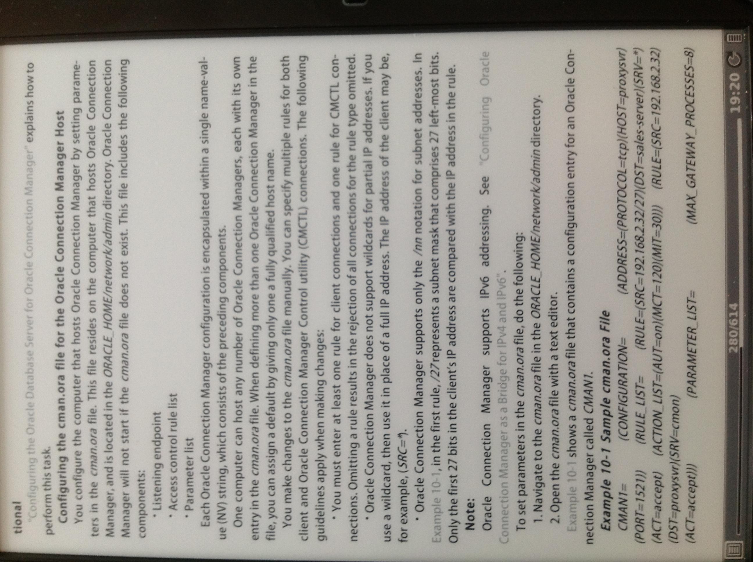 Attached some screen dumps. One set showing a page with Calibre, the other showing how M92 display this. My "big" issue is the lack of spacing. Especially between paragraphs. I do miss the use of this "space" feature to enhance readability. Is there anything I can do to enhance the reading experience with the M92? The second set of screen dumps (M92_2, Calibre_2) show the way a code section is displayed. I find the Calibre way of handling this way better. Especially longer listings become unreadable on the M92. Are there any style sheet like files somewhere that, when changed, might do this (I do know how to create an executable (shell script) on the M92)? BTW this is a document from Oracle. You should be able to download it if you want to check ideas or whatever. Details are: Oracle® Database Net Services Administrator's Guide 11g Release 2 (11.2) Part Number E10836-07 |
