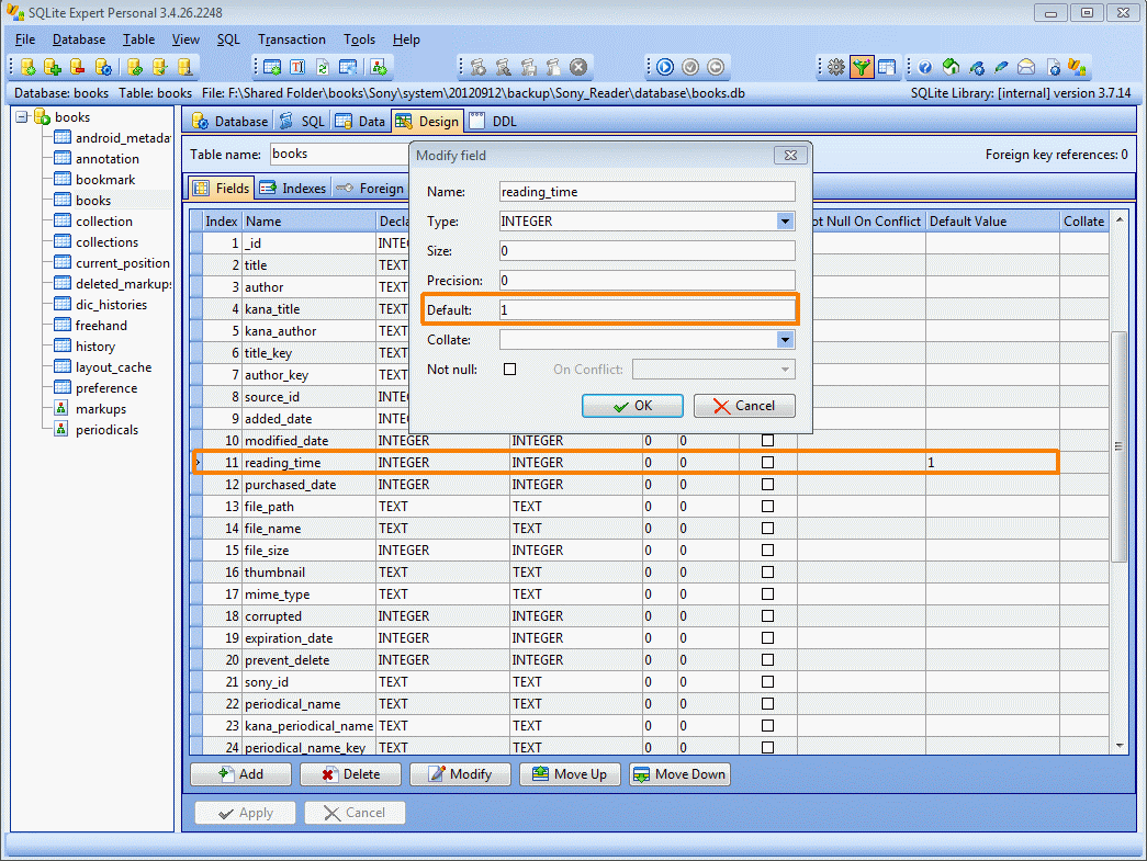 adb shell cd /mnt/extsd/Sony_Reader/database sqlite3 books.db update books set reading_time=1 where reading_time is null; |
