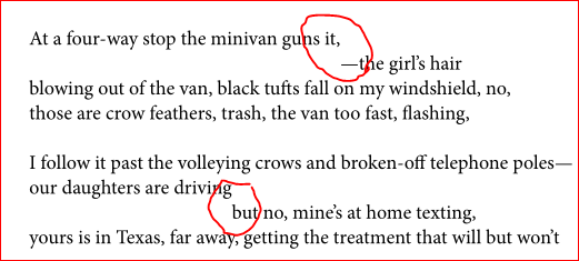 <p class="poemline">At a four-way stop the minivan guns it,</p> <p class="poemline"><span class="hemistich">At a four-way stop the minivan guns it,</span>--the girl's hair</p> Ideas? |