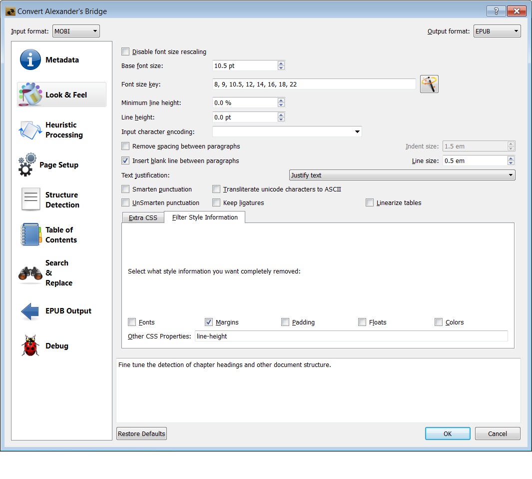 I'd try experimenting (or ask the question in the Calibre forum). Here is what I used to use for settings when I was converting to LRF. Try clicking on the Fonts check box in Filter style information also. You could also try embedding a font,it's in the LRF Output pane (although I've never tried it). The regular being displayed as italics sounds like more of a formatting error then a font error. I'm a couple of versions back on Calibre, so my screen shots may not match. Good luck. |