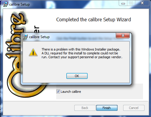 Every time I try to install a version, I get this error message: "There is a problem with this Windows Installer package. A DLL required for this install to complete could not be run. Contact your support personnel or package vendor." I'm wondering how I could fix this problem since installing // reinstalling doesn't do the trick. I've attached a screenshot of my error message, a bug report the program made after I tried to convert an epud file to mobi, and the original epub ebook. I've specifically tried to convert an ebook that calibre already successfully converted in the past, so I'm sure the problem isn't the ebook itself. Also, here is the error log I get when I tried to convert the file. Spoiler: