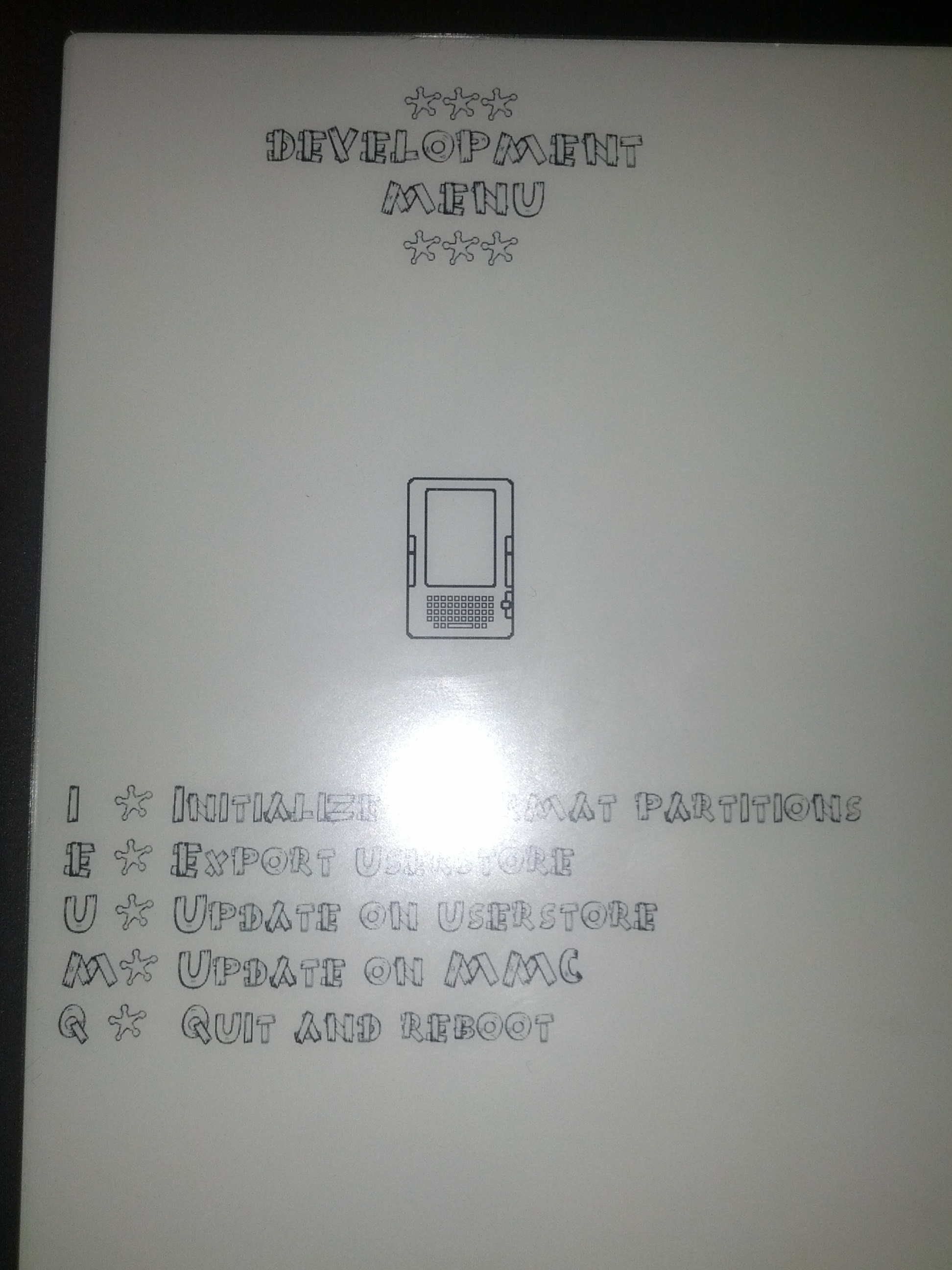 The Development Menu doesn't stay on screen very long, so you have to make your selection quick. I tried pressing E and U, but neither seemed to have any effect. Perhaps something would show up on the console if I could get that damn minicom working... Anyways, hope this helps the developers here in some way. |