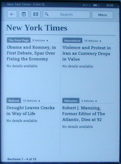 Thanks for responding to a beginner! ![]() OK there is obviously a different problem then. When I download the NY Times (full recipe that comes with Calibre and needs a username and password) I get this (Kindle Touch): Am I doing something wrong with the conversion to MOBI? I use all the default settings apart from on the page set up tab where I choose the Kindle as the output profile.My MOBI file (sorry its 5MB!) from the NY Times is attached. |