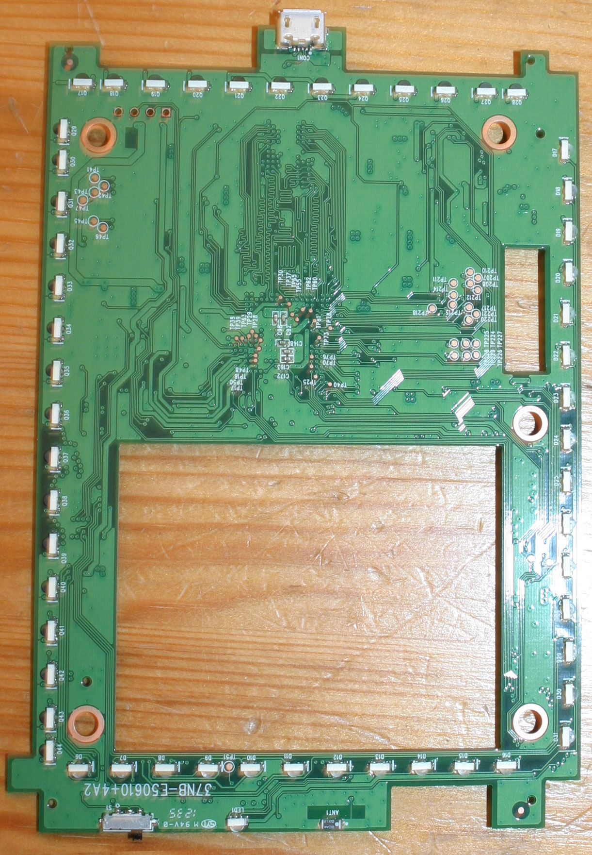 The serial header is 2.54mm but if you want to make use of it you'll have to solder so that the pins lie flush with the PCB and don't protrude at all.Disassembly is straightforward. Once the snap-on quilted cover is removed a thin plastic cover protects the PCB - six tiny philips screws have to be removed to remove that and access the board. Points of interest: 1000mAH battery Samsung K4X2G323PB-8GC3 256MB RAM Freescale i.MX507 CPU neonode NN1001 single chip touchscreen controller CyberTAN WC121 network controller TI 430G2333 (low power processor... hall effect?) TI TPS65185 EPD power supply (TPS report here) Serial port 3.3V (marked 'V') is unpowered when the device is shut down. Larger images in zip. |