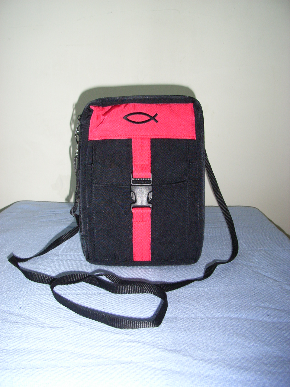The thing I like is it is un-flashy. It doesn't have a "steal me now" electronic gadget logo or "I'm a swanky, wealthy traveller" look about it, just the understated religious fishy symbol. Hopefully, better educated thieves (assuming their thought processes are unimpaired by illegal substances) will think I'm just carrying around my Bible and they won't bother doing a bag snatch on me. Check out your local religious goodies shop. |