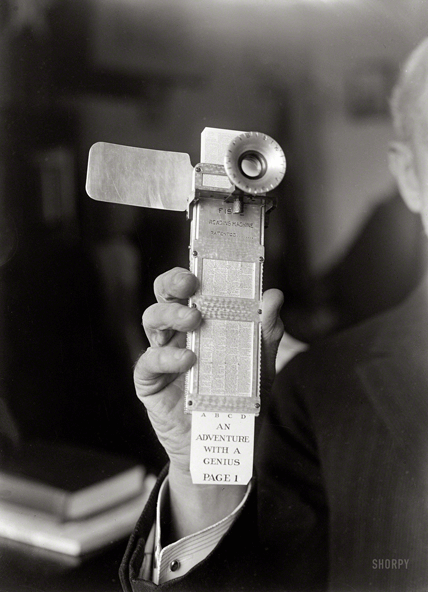 Das Prinzip dieser Maschine wurde (und wird noch) tatsächlich verwendet. Nur technisch eine Kleinigkeit anders realisiert. Als Datenträger wird statt Papier Mikrofilm verwendet. Die uns geläufigste Bauform sind die Lesegeräte für Mikrofiche. |