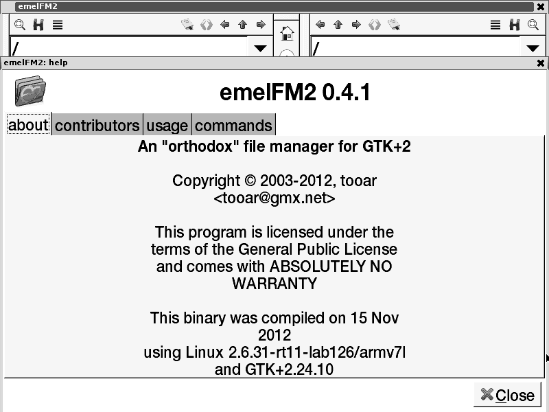 Xephyr :1 -title "L:A_N:application_ID:xephyr_O:R_PC:N" -screen 800x600 -cc 4 -dpi 155 &; DISPLAY=:1 emelfm2 (I optionally also load matchbox-window-manager to sort out the layout) Last edited by twobob; 11-15-2012 at 09:03 PM. |