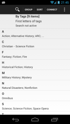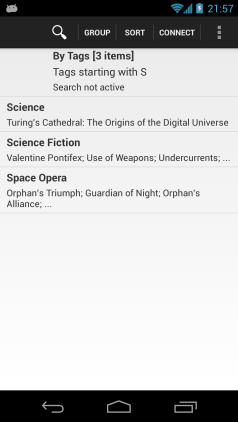 The first shows grouping by tags/first letter. The second shows the result of a long press on "S". This is the dialog that you see, giving you the choice of finding all books that match the item or all books that do not match the item. I tapped the "Matching" button, which says find books with a tag beginning with "S". The books have other tags, so those tags are shown as well. The header shows the calibre- and CC-equivalent search. If I wanted to I could change the grouping to by Series, by Author, or by anything. I could even turn off grouping. I would see only the books that have a tag beginning with S. This behavior is like calibre's restriction, in case you have ever used that. @Dopedangel: this is how you would view authors of books tagged with "Fantasy". You would long tap on Fantasy, select "Matching" to get the books with that tag, then group by Authors. The next screen shows what happens if I tap "Not matching", which finds all books without a tag beginning with "S". The header now has a "not" in the search string to tell you what it is doing. Note that there are no longer any "S" tags in the list, which is good because we asked for books with no tags beginning with "S". For the next screen, I cleared the search and then tapped on the tag "S" to open the list of tags beginning with S. I see three tags, one of which is not related to science fiction. I then long tapped on "Space Opera" and chose "Match", which selected all books with that tag. All my books with the tag "Space Opera" also have the tag "Science Fiction". The last screen shows what I see if I chose "Not match". I see all the books that do not have the tag "Space Opera". Note that the list of books with the Science Fiction tag is different from the screen shot above, because it is now showing books with "Science Fiction" but without "Space Opera". The non-fiction tag also appeared. Does this make sense to people? I know that it is hard to really know what something does without being able to play with it, but it would be a shame if I got this wrong coming out of the gate. |