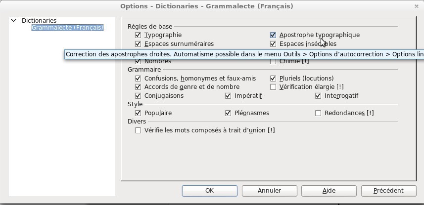Sure, I can search for a curly apostrophe. I usually pick up one from the closest sentence and put it in the search field. But this is not my point. I just propose that my version of Sigil could default to curly apostrophes (like my word processor - OpenOffice - does since I installed the Grammalecte extension) because I use curly ones (see joint attachment). Your version of Sigil would still be the same, with straight apostrophes because you use straight ones. Last edited by roger64; 02-04-2013 at 07:34 AM. Reason: Grammalecte options |