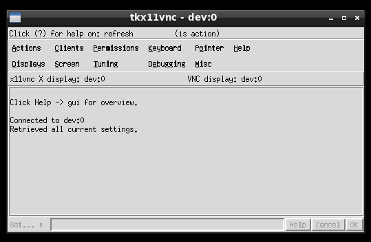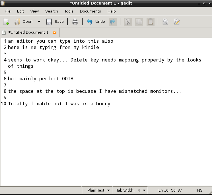 Things typed: ON PC: vncpassword (enter 8 digit password) x11vnc -rfbauth ~/.vnc/passwd -bg -accept "popup" -gone "popup" -rfbport 5900 -gui tray=minimal,iconfont=14x17 -forever -noxdamage -shared & (I also pictured a few variants of the x11vnc interface) ON PC: ssh root@kindleIP (now we are in kindle terminal effectively) then killall -stop cvm (to stop keystrokes from being swallowed) then [root@kindle root]# /mnt/us/kindlevncviewer/kvncviewer.sh -password password PCipaddress now we are rolling... the rest is pictured... I showed also the likely kindle TERMINAL output (the eink update messages in the shell) And the PC side... then the kindle side... You could convert this to scripts... or whatever... CONCLUSION: mainly worked. keystrokes and special symbol might be a PITA in the beginning until you get a config.LUA you like... I never bothered playing with that but feel with a little determination this could be a complete solution. EDIT: I NOTED THAT SYM+ some KEY does not produce a symbol... just fix that up... ALT + something did work but left you in an odd location. Tabbing wasn't immediately obvious how it might work and that would need love. Delete key didn't seem properly mapped OOTB Moving the cursor was entirely in-obvious. These are all setup issues though. perhaps with time they could all be configured in the config.lua. Didn't play around any further... Alternately you could go down the OTG usb route WITH THE KINDLE 4 and invert the colors PC side to fix the inverted framebuffer colors... either way. in a pinch this would work. Hope that helps. CNTRL +C then killall -cont cvm and press HOME on the kindle or... echo "send 139" > /proc/keypad echo "send 139" > /proc/keypad (same thing) to get the kindle back to normal. Last edited by twobob; 03-20-2013 at 01:05 PM. Reason: WITH THE KINDLE 4 |
