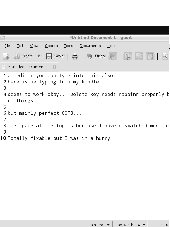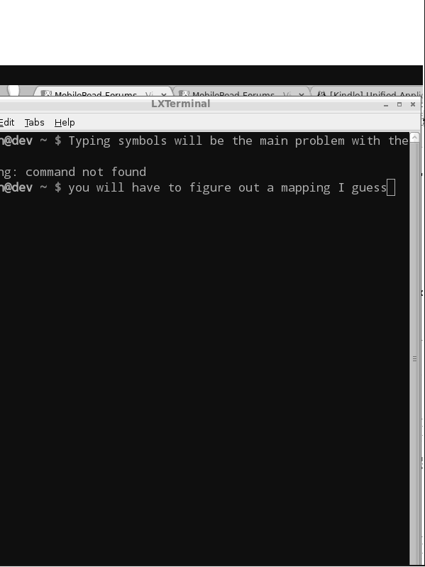 DEVICE: The k4 would have a inverted color set. so is possibly/probably not the right choice.. also you would need to run some extra code to manage the screen refresh which would extra pain/effort I would choose: k3 (or dx for extra luxury, it would have slow screen refresh but meh more screen real-estate, it [the dx] also may need the extra refresh code I would have to check it has been a while...) Personally I would: Just install the KUAL prerequisites bundle and KUAL itself. IIRC there is an extension already (which needs a bit of config but meh it's doable even for an end user) EDIT: ah yeah HERE Ubuntu is fine - (I use Ubuntu Mint so it would be much like my setup) EXAMPLE: I use my k3 to monitor when I should get out of the bath by VNC'ing into my machine and watching the build's roll by. CAVEAT: moving around on the screen is currently a bit of a PITA... no complete solution exists yet that I know of... k3: You would be restricted to an 800x600 resolution. or 600x800 It may not work EXACTLY as you imagine it might. but input is supported and configurable EXTRA TRICKINESS: The k4 does have an (extremely complicated) option of supporting OTG USB devices.. ( a mouse or an external keyboard) but that is still something that is on my TODO pile so I can't help you further there other than indicate it exists and point you to resources. Whether this would be extremely helpful I have no Idea... need more info and honestly I am just mentioning it here for completeness to the answer. EDIT: I note from your other posts around and about that this IS something that you are interested in... so might be worth the effort. But I cant help further with the final implementation. however there are all the modules you might need in the (as yet unreleased)kual-system project. But as I say... Can't guide you through that. K3 solution ALTERNATIVES: There is a solution to setup the device as an EXTRA screen (IIRC, yeah.. I am sure... I did it once EDIT: okay here just read the whole thread) and that may be an option but extra effort and research/reading/resources will be required. QUESTION: you say you are looking to "develop" on the device... In LaTex. What GUI do you use for that... or is it a text editor only job. I have no idea. FINAL THOUGHTS: I would even be happy to quickly mock up a check to see how realistic/good the solution might be (with screenshots) given more info... but I need more info. Hope that helps. Last edited by twobob; 03-20-2013 at 11:49 AM. Reason: links... |