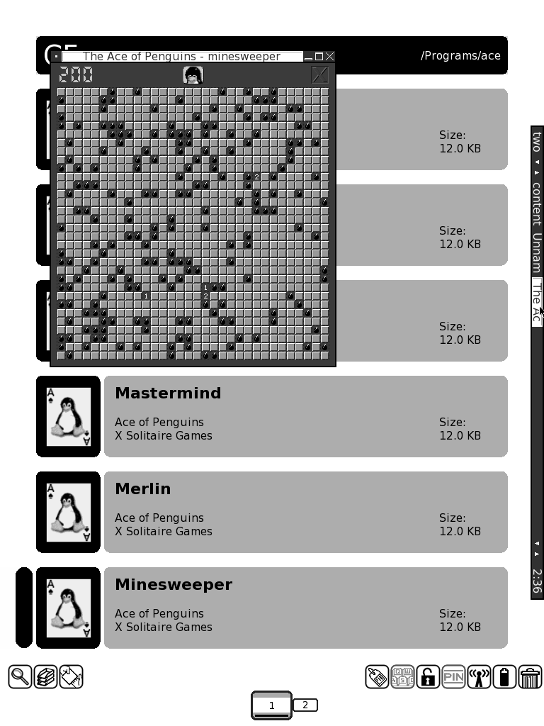 [04/02/2008] Thx Adam for moving this thread to the software release section & starting the thread Card Games for your iLiad. The not easy part of porting was to find the right place in src for the hack "Dialogs open as a window in iLiad's window mananger matchbox". It was hidden in the library, which use all card games. [The old teaser screenshots were created with running wm fluxbox.] specific stuff for game "Solitaire" : I choosed the connection "full screen refresh" to the dragging event [= you move stylus on screen; so [double] clicking is possible w/o triggering a full screen refresh] because the most action is when you move a stack of cards to another place. Draw a line on screen for full screen refresh. on the to-do-list: # remove usage of hacked libX11 [only Solitaire doesn't use it] # some games need right mouse button # disable LED blinking # the green background colour doesn't look nice on iLiad's screen I'm testing the Ace of Penguins [a bundle of 11 somehow solitaire games]. I was never a fan of solitaire, but it's quite cool on iLiad. A nice timekiller. screenshots: #1: game Solitaire, filemanager gentoo, windowmanager fluxbox #2: Uhhh. I won a Solitaire game. #3: Oh no! I clicked in Minesweeper on a bomb. Last edited by yokos; 04-02-2008 at 11:39 AM. Reason: EDIT 04/02/2008 |