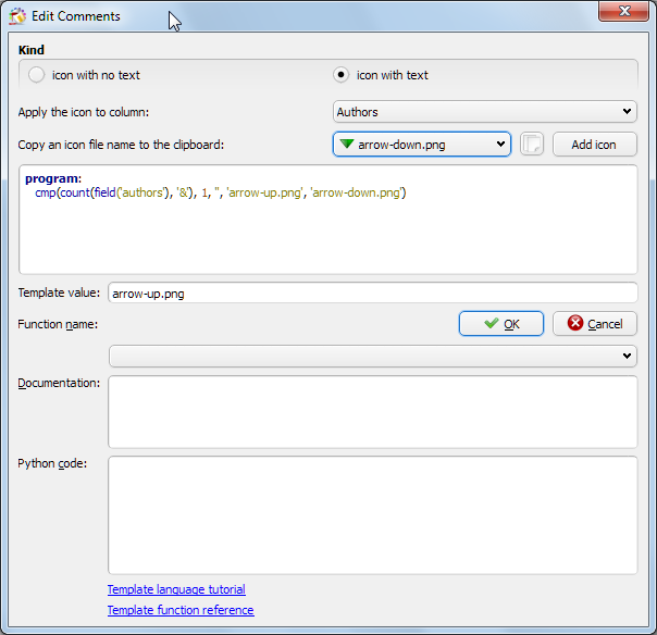 The following GPM template gets the number of authors. If that number is 1 it returns the icon file name for an up-pointing green triangle. If it is more than 1 it returns the icon file name for a down-pointing green triangle. Code:
