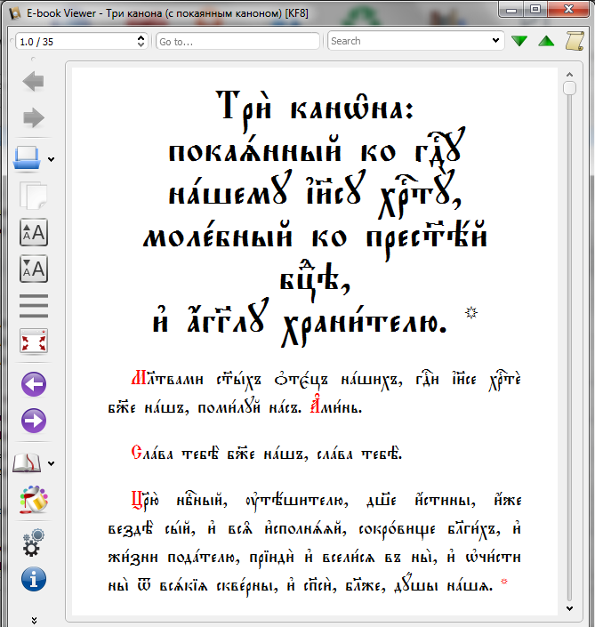 I tried Kindle viewer and it looks fine - attached. I've also attached a text version of input RTF. If you apply correct font, it looks fine on all viewers. The problem as you've pointed is encoding. This is old Slavonic text; there are plenty of websites and they all only displayed correctly if you have the right fonts installed. They are compartible with each other. Easiest format to read is PDF with embedded fonts; it always looks right on all devices. I'm really keen to use native Kindle format instead of PDF... Some encoding symbols can be seen here, I have not find a better explanantion of this encoding. http://www.fonts2u.com/orthodoxtt-ucs8.font Thanks a lot for your help. |