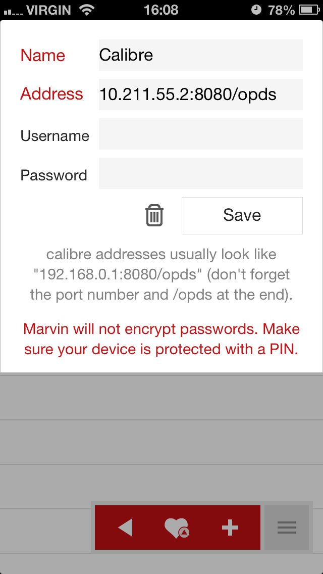 hoping someone can help me! so excited--i was up late last night downloading the new marvin app and couldn't get my iphone to connect with OPDS. I am able to connect with my Ipad, no trouble!!! I used the same calibre address that is on my ipad on my iphone but it keeps saying "oops, cannot download the feed". it's not an internet issue because i am able to connect to the Feedbooks Public Domain and Project Gutenberg! thanks for any help
