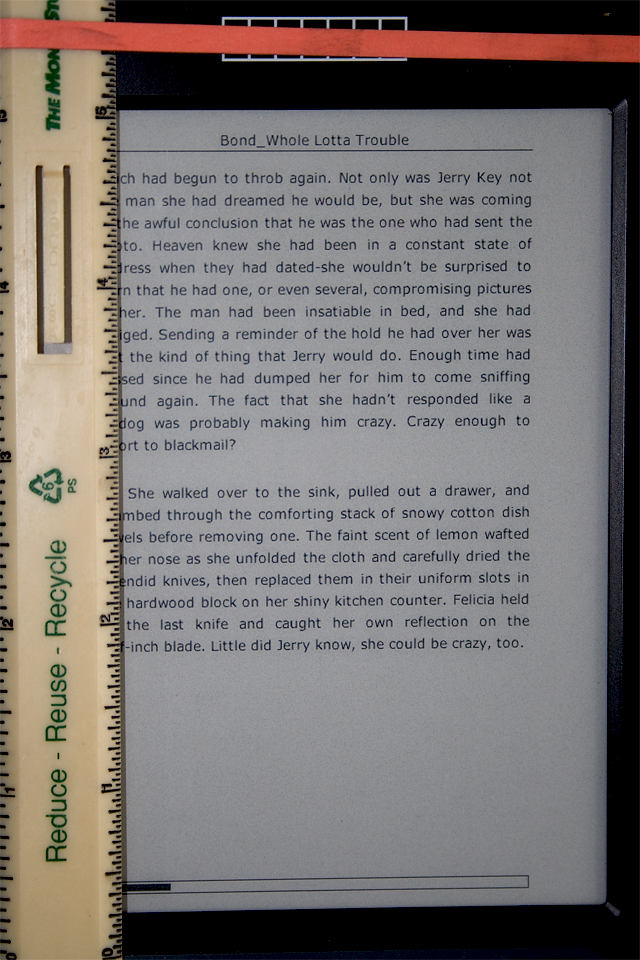 You can load any TrueType or OpenType font onto the machine, and view any book in any font at any of 12 different font sizes; I've illustrated the smallest and largest in the photos above (well, technically the next to smallest - the very smallest is the same size text, with wider margins). You can read PDF docs in landscape, but not (at least with the current firmware) Mobi books. |