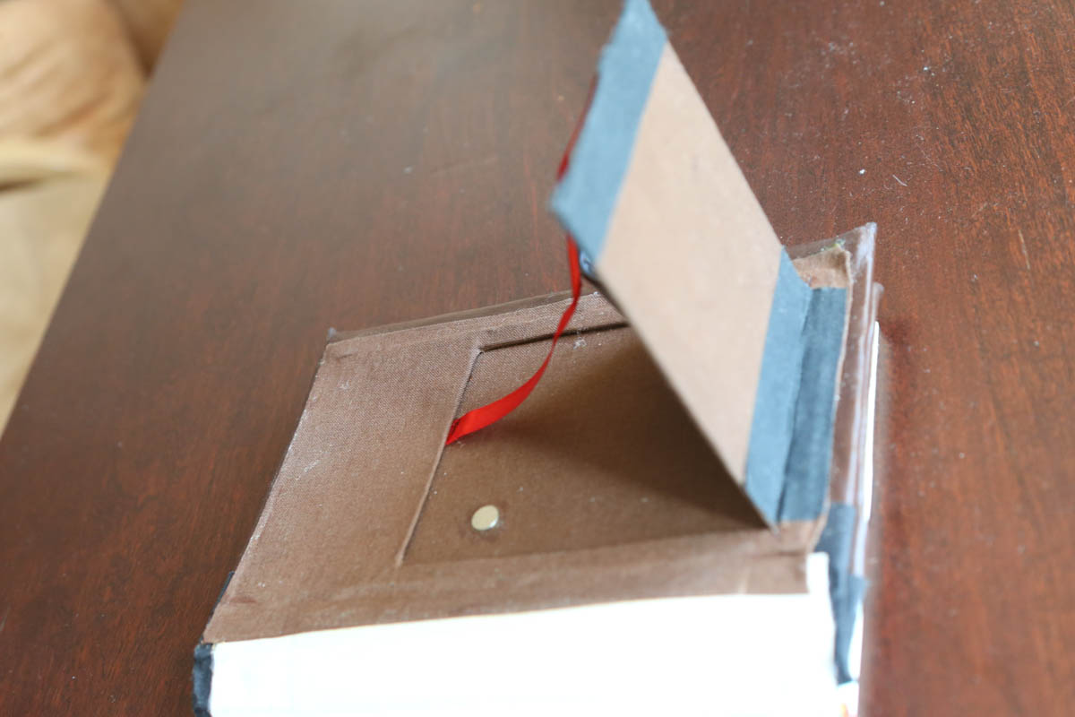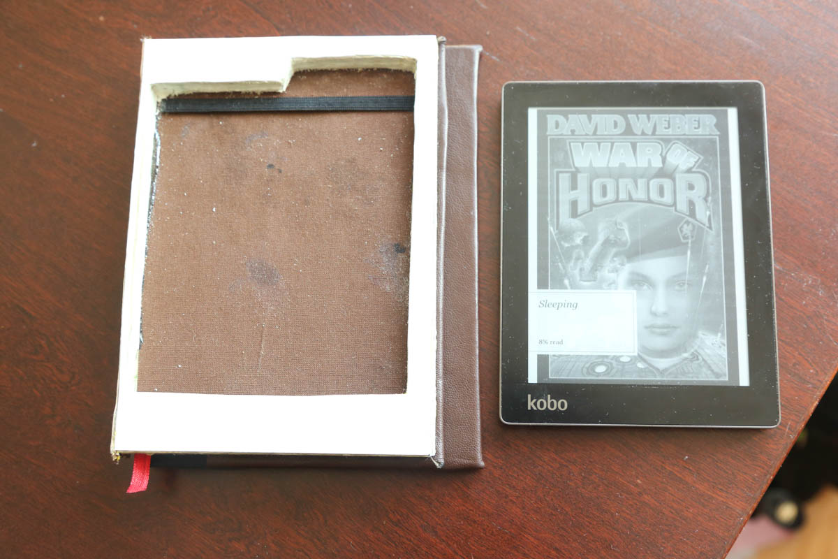 I put a magnet in the right spot to get the Aura to sleep when it's closed, and there's a built in stand for propping the reader up when I'm sitting at a table. It also folds fully back for easy one handed reading. I made the cover out of a book (went to B&N and looked through the clearance until I found something that both fit, and that I wouldn't mind cutting up). Took it apart completely, glued the page block into three sections, cut out the casing. Reinforced it with nails, and added a plastic cover to the page block. Then re-bound the covers with leather, added magnets to keep it closed. Attached the whole thing back together. Stand was made out of a piece of aluminum that I cut and then sanded the rough edges off. Everything is wrapped in either leather or book-cloth. There's also a fake bookmark sticking out of the bottom, primarily to let me know which way is up. Total time taken, about three days, two to three hours a day, and keeping it under a press overnight for the glue to set. |