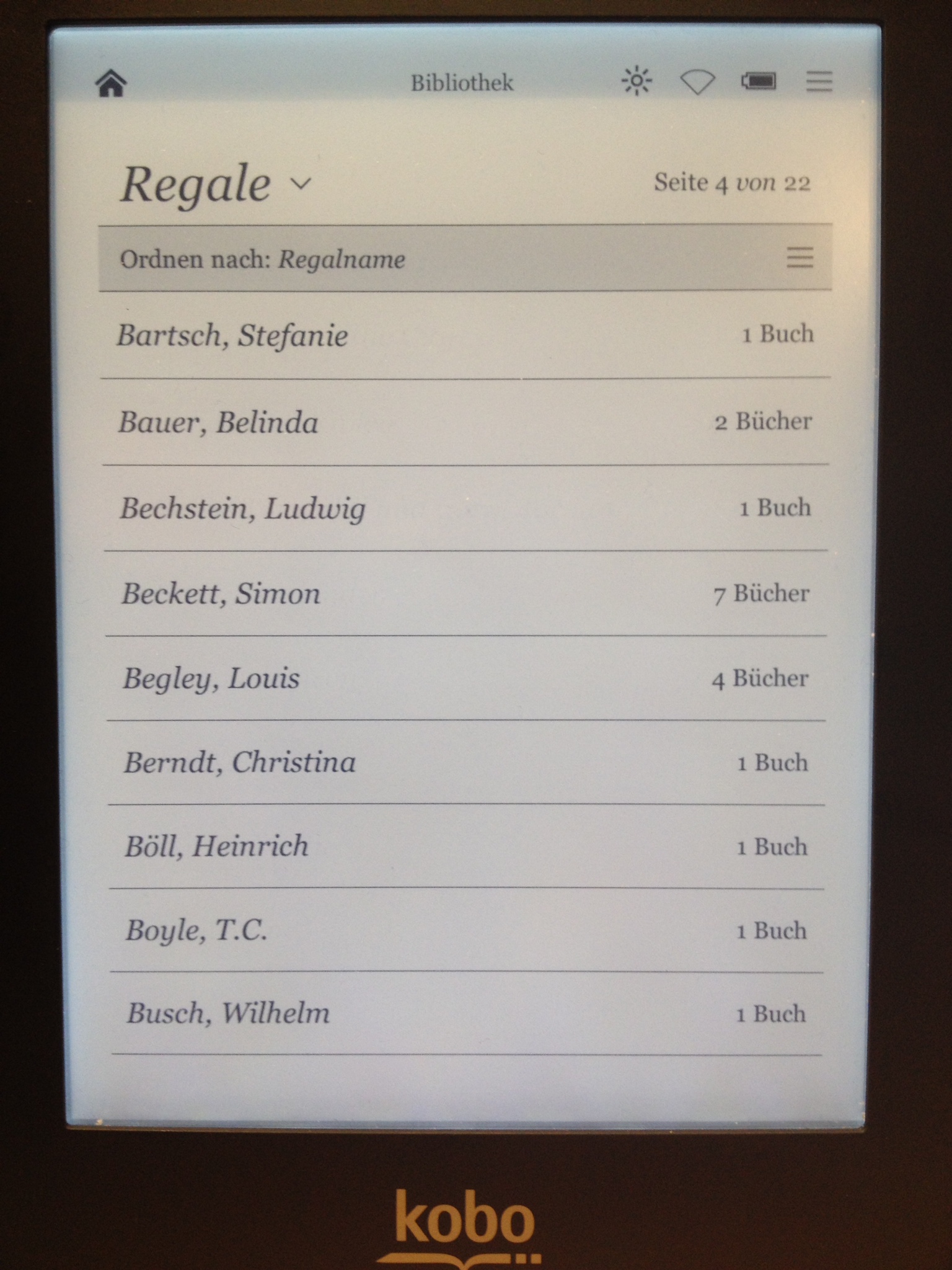 I created two custom columns in Calibre. 1. custom column = regal (this is used to get a collection for different genres) program: $=field('tags'); first_non_empty( contains($,'Roman','1. Romane',''), contains($,'Krimi & Thriller','2. Krimi & Thriller',''), contains($,'Novelle & Erzählung','3. Novellen & Erzählungen',''), contains($,'Lyrik','4. Gedichte',''), contains($,'Drama','5. Dramen',''), contains($,'Märchen','6. Märchen',''), contains($,'Sachbuch','7. Sachbücher','') ) 2. custom column = serie_kobo {series:| 8. Serie: |} The KoboTouchExtended plugin is configured “collections: authors, #regal, #serie_kobo” When I open the library by choosing collections I get on the first page the genre collections “1. Romane” to “7. Sachbücher”, followed by collection “8. Series: AAA, 8. Series: BBB, 8. Series: CCC” and so on. After the “8. Series: XYX” collections the authors with their books are shown, no matter of genre or within a series. In your case, you only need the second custom column and change the prefix of the series in “1. Series:” To get a better impression look at the pictures of the first four pages of my library. Maybe this is a solution for you and your mother. |