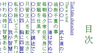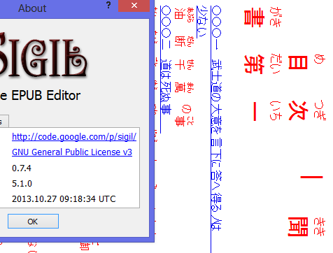 It turns out that this epub is too complex for my poor little Sony. I can only display the table of contents and jump to the last page; any other navigation causes a reboot. The version of ADE in the Sony doesn't even attempt to display vertically, I see question marks going left to right instead of up and down. My desktop version of ADE (2.0.67275 on Mac) does show vertically, but almost all of the glyphs show as boxes. On one page where there is mixed Japanese and Latin, the Latin characters are properly rotate 90 degrees while the Japanese text is properly right side up. I think the whole book would display properly if I had the right fonts installed. From this I think that modern reader with updated ADE might handle the book all right. I'm guessing this might be a moderately difficult change to Sigil unless there is Qt support. |