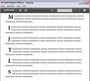 But in ADE the effect is rather gruesome (screenshot attached). There text lines leave some empty space for the drop cap, but the drop cap is placed outside this empty space, over the text. It looks as if the float is not obeying text-indent. A quick test in my reader showed the same behaviour. I can easily work around it by adding some margin-left (and increasing margin-right), but then it does not work properly in a browser or, I guess, in non-Adobe readers. Does anyone have some working (in ADE or, at least, Adobe-based readers) code for drop-caps in poetry, or any new ideas? |