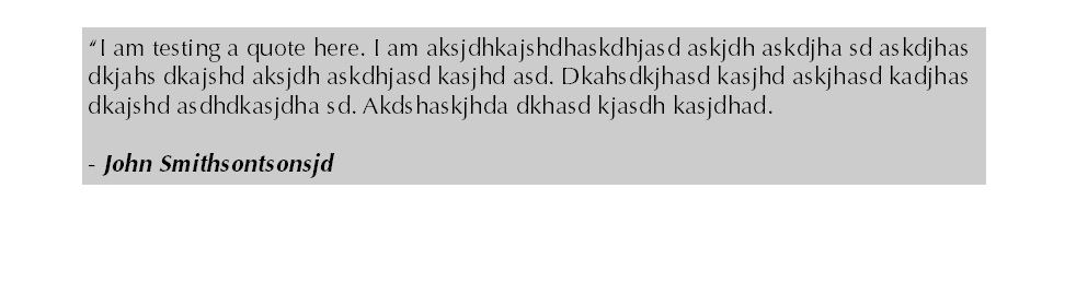 ![]() Here is an earlier topic where someone wanted a "blog post" in their book. I attached a sample EPUB in Post #5, and images of its usage right out of the original book in post #10: https://www.mobileread.com/forums/sho...d.php?t=218023 Here is also another book that I touched up for an author on MobileRead who was having odd formatting problems from B&N (with images + sample): https://www.mobileread.com/forums/sho...0&postcount=54 As you can see, I just used that initial code as a base, and built up from there. ![]() So in your case, you probably just want to use something like this in your CSS: Code: