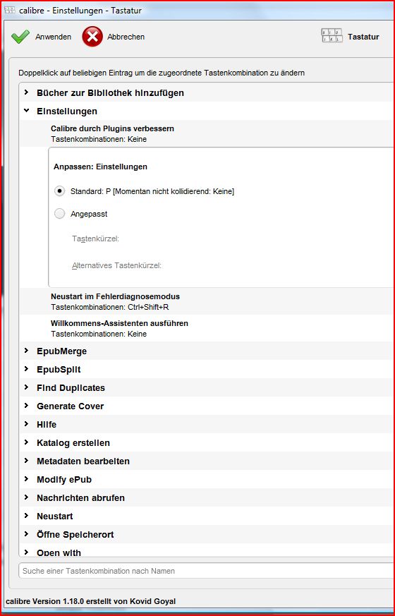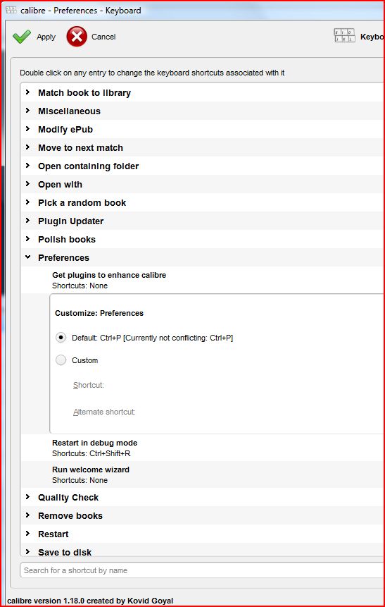 I have a question due to a discussion in a German forum. There came up a request how to enter into preferences if a user had deleted by mistake the icon from the tool bar. In the English version I can use the shortcut Ctrl+P by default for enter into the preferences. In the German version it is P w/o Ctrl what is in conflict to polish books. Is there a particular reason not to use Ctrl+P as in the English version and if there is none, can I ask for an update to Ctrl+P as default? I guess this is better as to have no shortcut for preferences in the German GUI. |