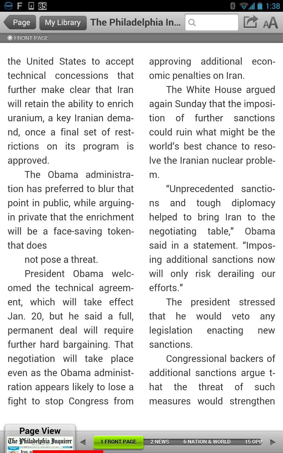 To add insult to injury, they achieved this dubious technical feat by using the epub-standard breaking Adobe extensions (ade:template), and compounded this by the worst sin of all: rather than creating a single xpgt file to define the page layout, instead the publisher has inserted a huge ade:template element inline into each xml file in the epub. This makes it time consuming to strip out. I have worked around the two column problem by replacing column-count="2" with column-count="1", which makes the necessary changes to all the inline ade:templates. Anyway, how do you like your emagazines/enewpapers: one or two columns? |
