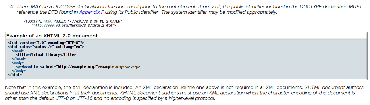 There is currently a difference betwen calibre's Editor and Sigil. The Editor gets systematically rid of the DOCTYPE and Kovid Goyal writes that the DOCTYPE is required only when there are named entities (like nbsp). I am personnally quite happy with this but I hear people arguing against it nearly for "moral" reasons. Illegal, non respect of such norm, and so on. I would like to find the reference file where this is an allowed use. The problem for me is that any document I find gives a reference to another and so on. I am sure this is old news, because some years ago already, writer2xhtml offered an option to produce an EPUB2 (EPUB3 was non-existent at that time) using only UTF8 or UTF16 characters - like the Editor today. (see screenshot) I speak about the common EPUB2 not about EPUB3, html 5 or anything else. I found in the xhtml 1.1 specs telling that the DOCTYPE was required (screenshot 2). But there is another one about xhtml 2 which says that it MAY only be required (screenshot 3) and is only necessary "when the character encoding of the document is other than the default UTF-8 and UTF-16" but it's a draft. Which one applies to EPUB 2? How old is the xhtml 2 specification? IDPF specifies for the EPUB 2.01 (May 2010), that the required MIME media type for application/xhtml + xml must be XHTML 1.1. That would mean that a DOCTYPE is required. http://www.idpf.org/epub/20/spec/OPS...m#Section1.3.4 Last edited by roger64; 02-23-2014 at 06:44 AM. |