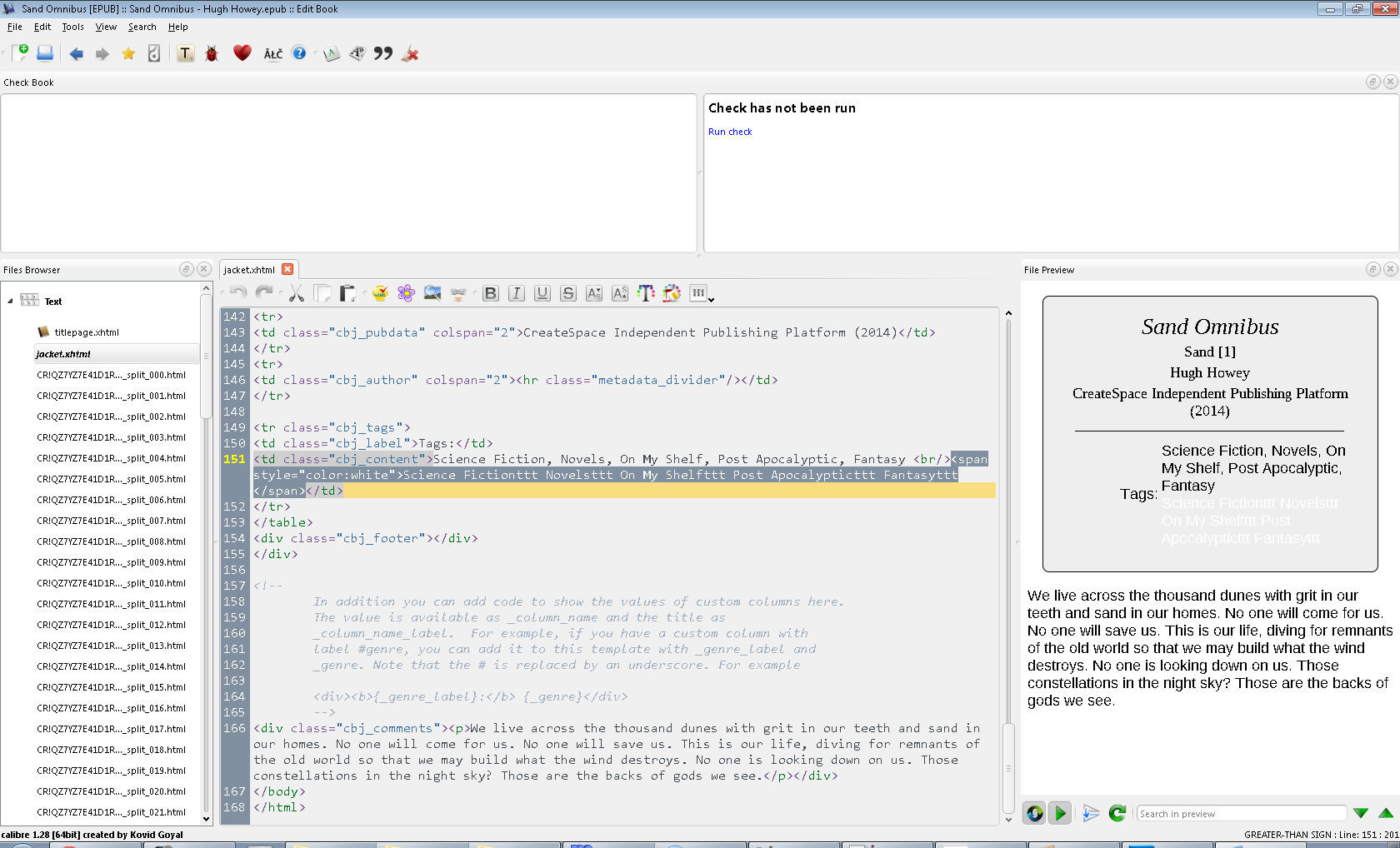I've setup the override Resources folder and copied the Jacket template.xhtml and stylesheet.css to it, and I can edit and change how the page looks, but the contents of the {Tags} template name is of course not editable here and that's what is showing up incorrectly. I'm running Calibre 1.28 64 Bit on Windows 7, I've removed all my plugins and it gives the same results, and as you can see in the images attached it doesn't matter which file type I use it's the same in AZW3 and EPUB. |